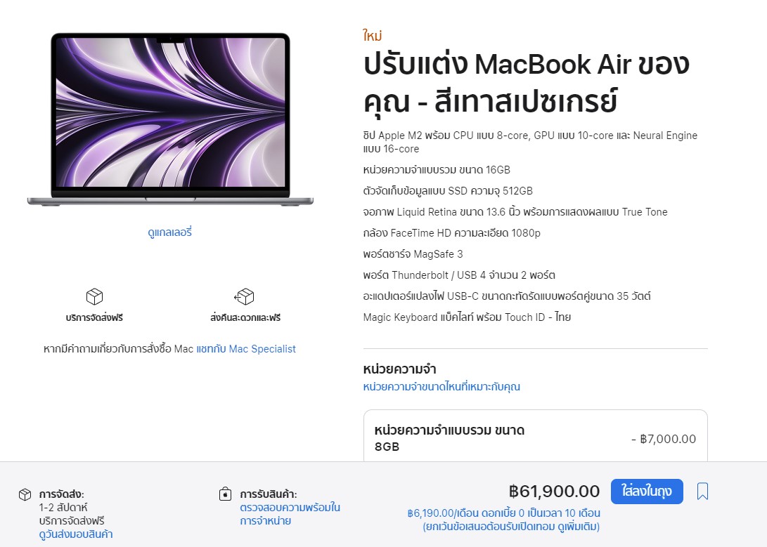 เรื่องสเปคนี้แนะนำให้คิดง่าย ๆ เลยว่าเราซื่อ MacBook Air มาเพื่อทำอะไร หากการใช้งานโดยทั่วไป ไม่ได้มีตัดต่อวีดีโอหรือต้องรันโปรแกรมเยอะ ๆ หนัก ๆ ก็จะเลือกตัวเริ่มต้น RAM 8 GB SSD 256 GB แต่หากมีงบประมาณอาจจะดูย่อยต่อได้ว่าหากเราจะอัพเกรด RAM หรือ Storage เพิ่มดี เช่น หากต้องเลือกอย่างใดอย่างหนึ่งได้เท่านั้นแนะนำว่าควรเพิ่ม RAM เป็น 16 GB มากกว่า เนื่องจากว่าพบว่าหลายคนพอใช้ไปนาน ๆ จะเริ่มทำอะไรที่มากขึ้น เช่น หันไปตัดต่อวีดีโอ ก็อาจจะทำให้เราไม่สามารถเพิ่ม RAM ได้ในอนาคตเพราะเครื่อง Apple นั้นประกอบมาจากโรงงาน จะไม่ได้เพิ่มได้ง่าย ๆ เหมือน Notebook ทั่วไป ส่วนเรื่องของความจุ SSD นั้นอาจจะยังพอแก้ปัญหาได้โดยการซื้อ SSD มาต่อกับเครื่องได้ เดี๋ยวนี้มีขนาดเล็กพกพาสะดวกและราคาถูกกว่าเมื่อก่อนมาก แต่ใด ๆ หากมีงบไม่อั้นก็สามารถเลือกสเปคเองได้ โดยเราสามารถเพิ่ม RAM ได้สูงสุดที่ 24 GB เพิ่ม SSD ได้สูงสุดที่ 2 TB และชิปประมวลผลนั้นมี GPU ให้เลือก 2 แบบคือ 8-core และ 10-core (เพิ่ม 4,000 บาท) ลองจิ้มราคาดูได้ที่หน้าเว็บไซต์ของ Apple