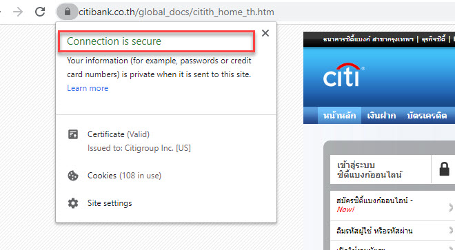 ตัวอย่างเว็บที่มี SSL อย่างของ Citibank.co.th เราสามารถคลิกที่รูปกุญแจเพื่อดูรายละเอียดของ Certificate เว็บไซต์ที่ปลอดภัยได้