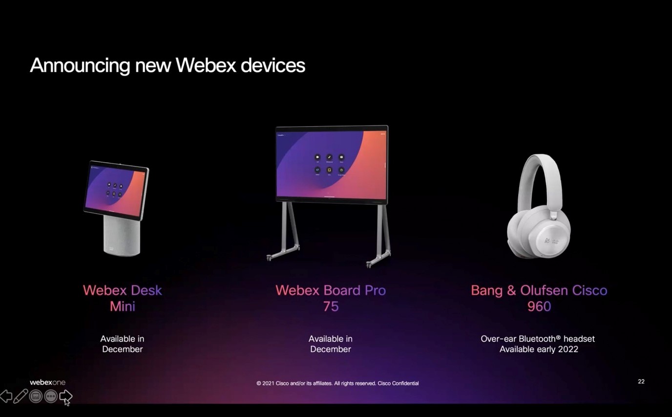 • รองรับการทำงานครีเอทีฟร่วมกันด้วยระบบไวท์บอร์ด: Webex Whiteboarding ช่วยให้ผู้ใช้สามารถสร้าง ค้นหา แก้ไข และใช้ไวท์บอร์ดร่วมกันกับคนอื่นๆ รวมถึงบุคคลที่อยู่ภายนอกองค์กร โดยใช้อุปกรณ์มือถือ แท็บเล็ต แล็ปท็อป หรืออุปกรณ์ Webex ที่รองรับระบบสัมผัส เช่น Webex Board Pro รุ่นล่าสุด ทั้งนี้ Webex Board Pro ประกอบด้วยระบบประชุมผ่านวิดีโอ, กล้อง 4K สองตัว, ระบบเสียงแบบกำหนดทิศทาง, ปากกาสไตลัส 2 ด้าม และจอแสดงผล 55 หรือ 75 นิ้ว  Webex Board Pro จะเปิดให้สั่งซื้อในช่วงเดือนพฤศจิกายน 2564 ราคาเริ่มต้นที่ 8,995 ดอลลาร์ (55 นิ้ว) และ 14,995 ดอลลาร์ (75 นิ้ว)