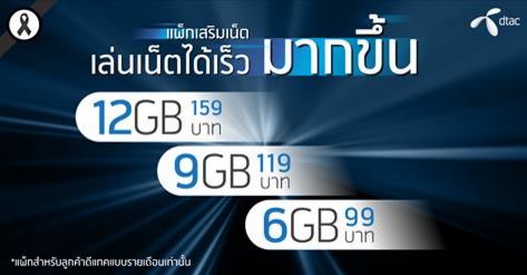 dtac จัดโปรโมชันอินเทอร์เน็ตมาแรงแซงคู่แข่งอีกระดับกับโปรเน็ตเต็มสปีดปริมาณเริ่มต้นที่ 6 GB 99 บาท, 9 GB 119 บาท และ 12 GB 159 บาท โดยโปรโมชันเน็ตนี้จะมีอายุการใช้งาน 7 วัน ซึงจะเหมาะอย่างมากกับคนที่ต้องใช้อินเทอร์เน็ตในปริมาณที่สูงขึ้นในบางช่วงเวลา เช่น ไปเที่ยวหรือทำงานนอกสถานที่