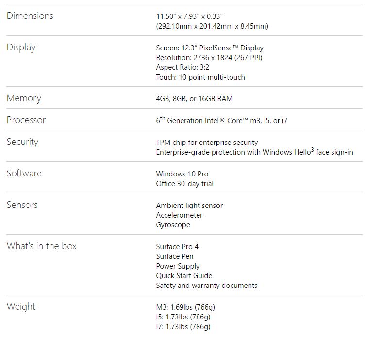 รุ่นของ Surface Pro 4 ที่ร่วมรายการ
