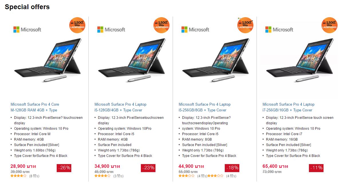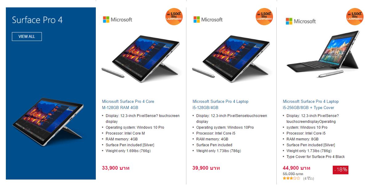 สำหรับ Surface Pro 4 ที่ทาง Lazada ร่วมกับ Microsoft จัดโปรโมชันนี้ลดราคามี 5 รุ่นจากทั้งหมด 8 รุ่น โดยจะแถม Type Cover มาให้ด้วย ซึ่งนับว่าคุ้มมากครับเพราะโดยปกติต้องซื้อแยกกันต่างหากในราคา 5,190 บาท ซึ่งท่านใดที่กำลังเล็ง Tablet ตระกูล Windows อยู่ก็ถือเป็นจังหวะที่ดีที่จะได้ซื้อของคุณภาพในราคามิตรภาพหน่อยนะครับ พร้อมแล้ว ไปช้อป Surface Pro 4 ที่ Lazada กันดีกว่าครับ