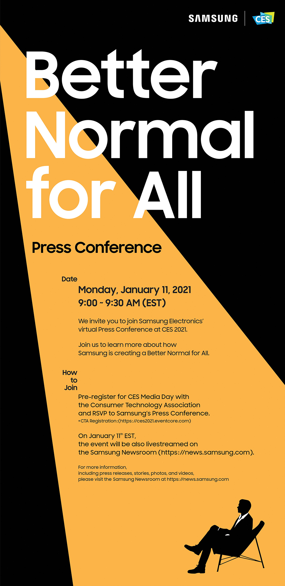 ธีม “Better Normal for All” มาจากแนวคิดที่ว่า เทคโนโลยีที่ดีสามารถพาเราไปสู่อนาคตที่ดีกว่าเดิมได้ ในงานแถลงข่าวของซัมซุงที่ CES เราจะได้อวดโฉมอนาคตที่ดีกว่าเดิมให้ทุกท่านได้เห็น ตัวอย่างเช่น เทคโนโลยีที่ถูกดีไซน์มาเพื่อคุณโดยเฉพาะ ปัญญาประดิษฐ์ (AI) ที่จะยกระดับการใช้ชีวิตภายในบ้าน และนวัตกรรมต่างๆ ที่สามารถเปลี่ยนสังคมและโลกได้ ตัวอย่างเทคโนโลยีคร่าวๆ ที่คุณจะได้พบในงานแถลงข่าวของซัมซุง ได้แก่