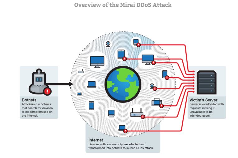 ในเดือนตุลาคมปี 2016 ผู้บุกรุกใช้ประโยชน์จากอุปกรณ์ IoT ที่มีการรักษาความปลอดภัยไม่ดีพอ  ในการโจมตีแบบ DDoS (Distributed Denial of Service มีจุดประสงค์เพื่อให้ระบบหยุดการทำงานจนไม่สามารถใช้เครื่องคอมพิวเตอร์ได้ทั้งระบบ) โดยโจมตีอุปกรณ์ IoT ประมาณ 100,000 รายการและทำให้เว็บไซต์ต่าง ๆ เช่น Twitter, Reddit และ Spotify ต้องทำงานแบบออฟไลน์ ไปหลายชั่วโมง