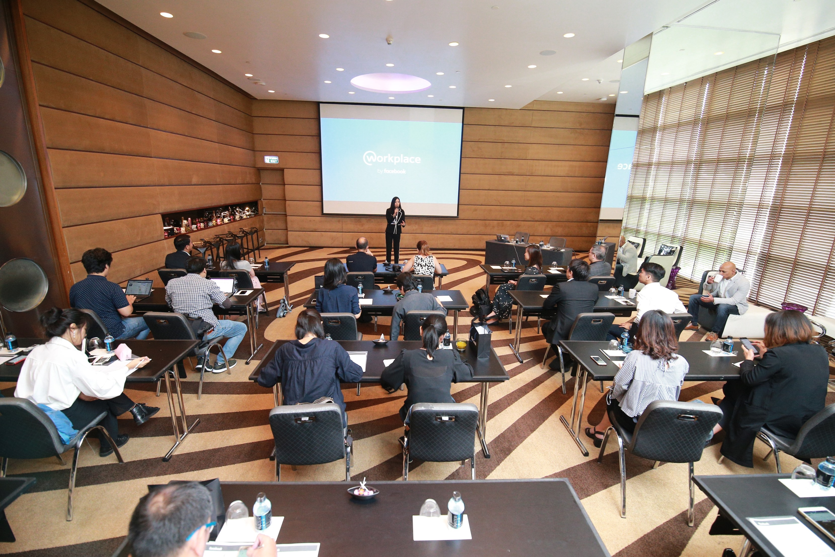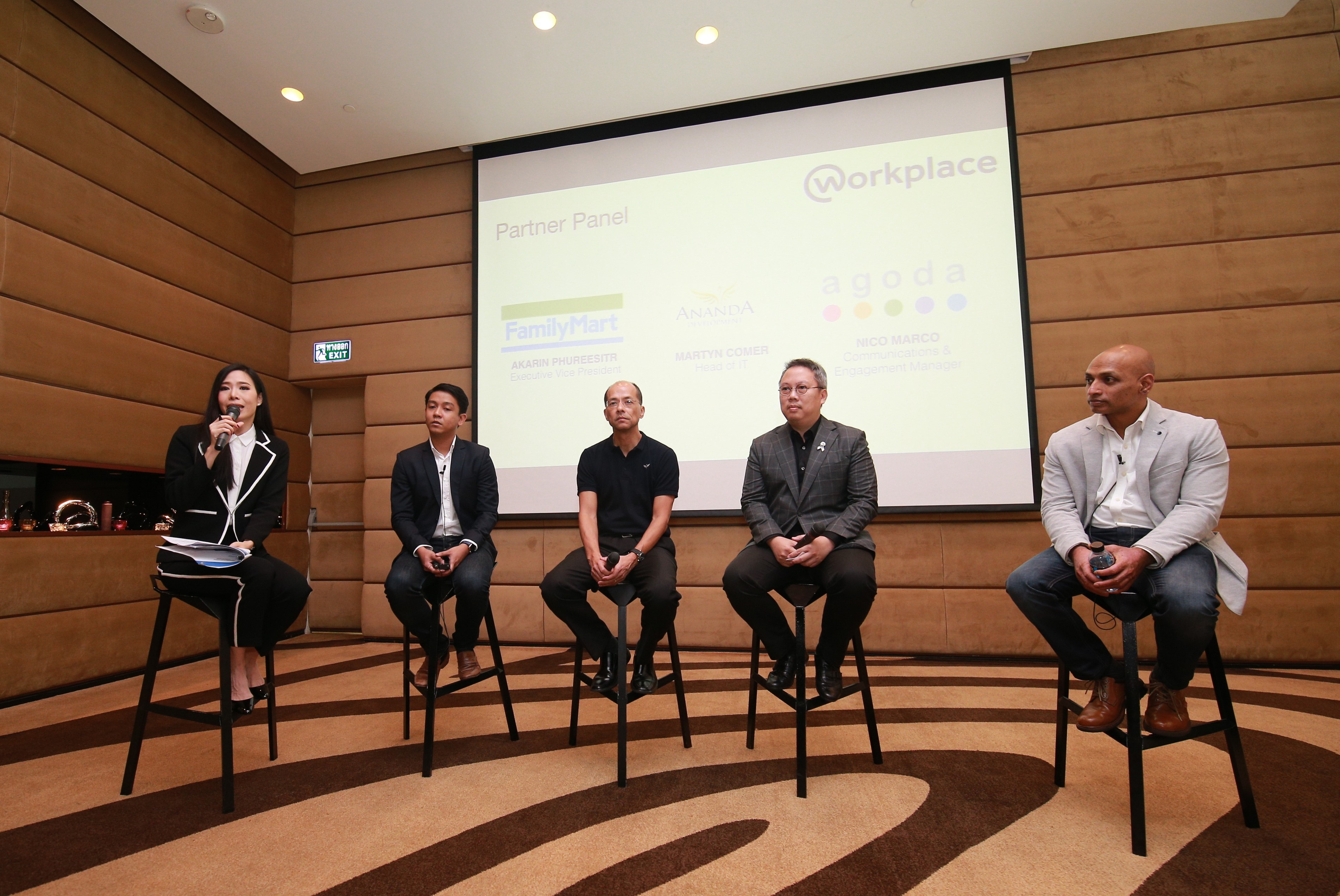 Workplace by Facebook นำโดยคุณราเมช โกปาลกฤษณะ (ขวา) หัวหน้าฝ่าย Workplace by Facebook ประจำภูมิภาคเอเชียแปซิฟิก เผยถึงเทรนด์ของ Workplace ซึ่งเริ่มได้รับความนิยมจากบริษัทและองค์กรต่างๆ ในประเทศไทย พร้อมทั้งร่วมพูดคุยกับพันธมิตรจากบริษัทต่างๆ คุณอัครินทร์ ภูรีสิทธิ์ (ซ้าย) รองกรรมการผู้จัดการใหญ่ บริษัท เซ็นทรัลแฟมิลี่มาร์ท จำกัด, คุณมาร์ติน โคเมอร์ (ที่ 2 จากซ้าย) หัวหน้าฝ่ายไอที บริษัท อนันดา ดีเวลลอปเมนท์ จำกัด (มหาชน) และคุณนิโก มาร์โก (ที่ 2 จากขวา) ผู้จัดการฝ่ายสื่อสารและส่งเสริมความสัมพันธ์ลูกค้า บริษัท อโกด้า